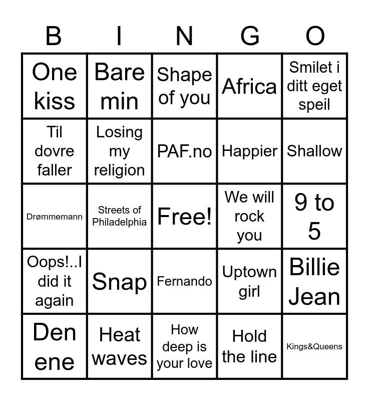 This bingo card has a free space and 24 words: Snap, Heat waves, PAF.no, Den ene, Smilet i ditt eget speil, One kiss, Til dovre faller, Bare min, We will rock you, Fernando, Happier, Drømmemann, Uptown girl, Billie Jean, Losing my religion, Hold the line, 9 to 5, Shape of you, Shallow, Streets of Philadelphia, Kings&Queens, Oops!..I did it again, Africa and How deep is your love.