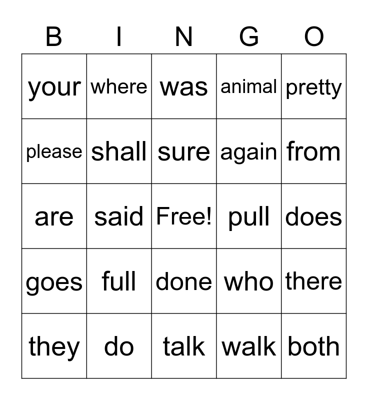 This bingo card has a free space and 29 words: they, one, said, you, your, was, shall, full, pull, do, does, both, talk, walk, from, here, done, goes, pretty, are, who, what, again, please, animal, where, there, sure and when.
