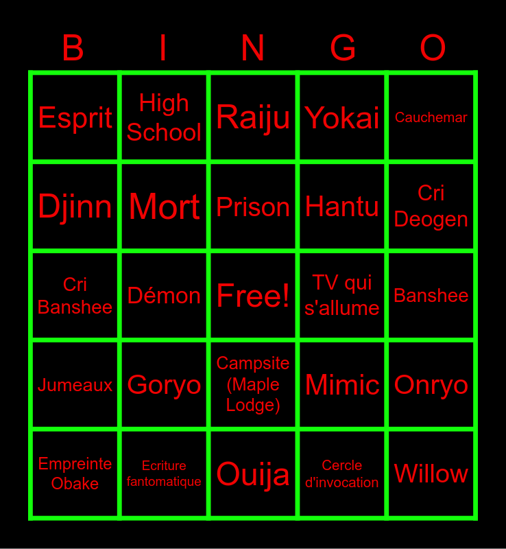 This bingo card has a free space and 68 words: Ridgeview, Willow, Edgefield, Tanglewood, Bleasdale, Grafton, High School, Camp, Prison, Sunny Meadows, Campsite (Maple Lodge), Sunny Meadows (Restricted), Banshee, Cauchemar, Deogen, Djinn, Démon, Esprit, Fantôme, Goryo, Hantu, Mimic, Jumeaux, Moroï, Myling, Obake, Ombre, Oni, Onryo, Poltergeist, Raiju, Revenant, Spectre, Thayé, Yokai, Yurei, EMF 5, Empreinte Obake, Cri Deogen, Cri Banshee, D.O.T.S Sans caméra, Bougie éteinte, Mort, Entité brise ampoule, Lumière rouge, Téléphone sonne, Radio qui s'allume, Douche, TV qui s'allume, Ecriture fantomatique, Chaise à bascule qui bouge, Entité joue du piano, Alarme de voiture, Ouija, Vaudou, Miroir, Cercle d'invocation, Tarot, Boîte à Musique, The High Priestess, The Hanged Man, Old fantôme (+50 ans), Cage Thoracique, Kevin se sacrifie (mort), Antoine loop et loupe (mort), Brandon est dehors durant une chasse, Kevin rate photo and Antoine croit voir des orbes.