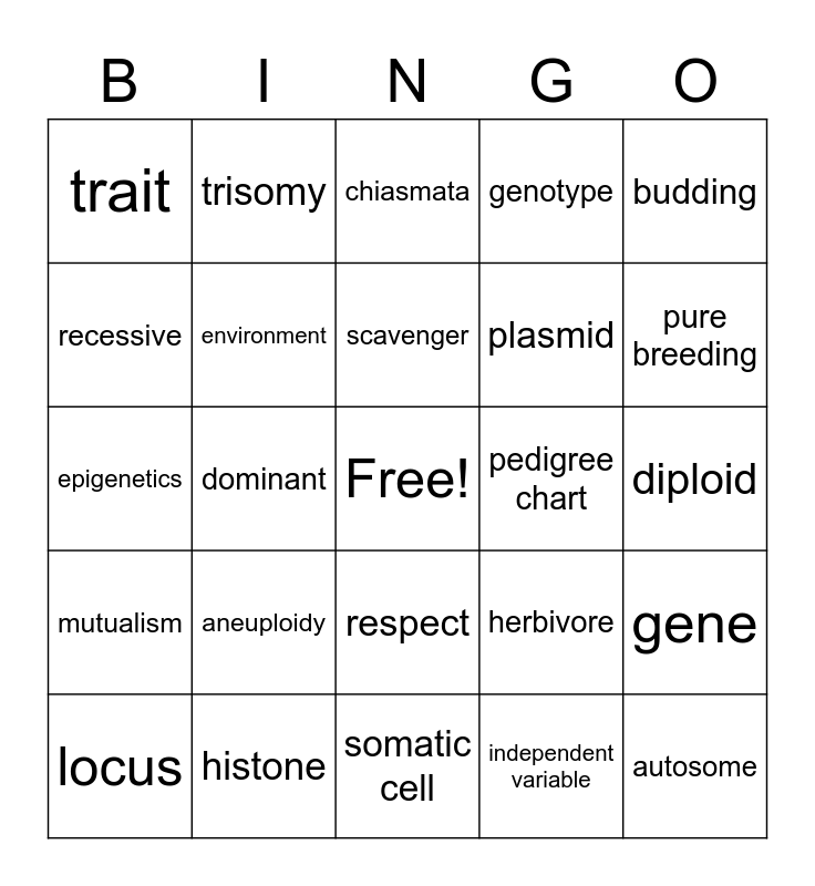 This bingo card has a free space and 36 words: abiotic, amensalism, consumer, environment, herbivore, mutualism, scavenger, clone, budding, spore, dominant, genotype, linked genes, pedigree chart, pure breeding, trait, phenotype, aneuploidy, autosome, chiasmata, diploid, gene, histone, locus, somatic cell, trisomy, epigenetics, double helix, plasmid, recessive, dihybrid cross, dependent variable, independent variable, respect, precise and control group.