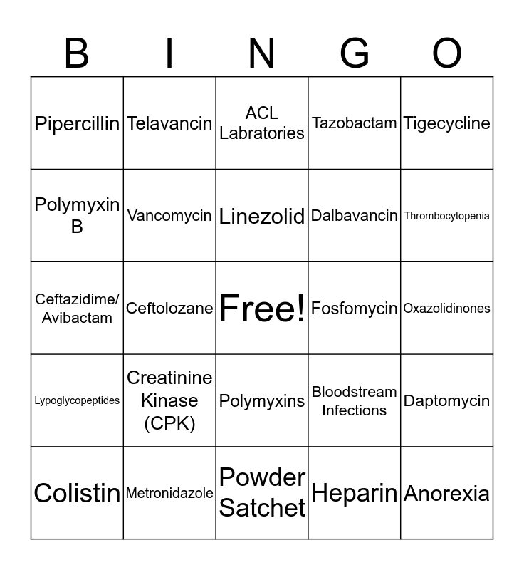 This bingo card has a free space and 26 words: Polymyxins, Heparin, Linezolid, Metronidazole, Tigecycline, Pipercillin, Polymyxin B, Telavancin, Oxazolidinones, Bloodstream Infections, Dalbavancin, Ceftazidime/ Avibactam, Daptomycin, Colistin, Ceftolozane, Urinary Tract, Tazobactam, Lypoglycopeptides, ACL Labratories, Anorexia, Thrombocytopenia, Powder Satchet, Fosfomycin, Creatinine Kinase (CPK), Vancomycin and CUW-SOP.