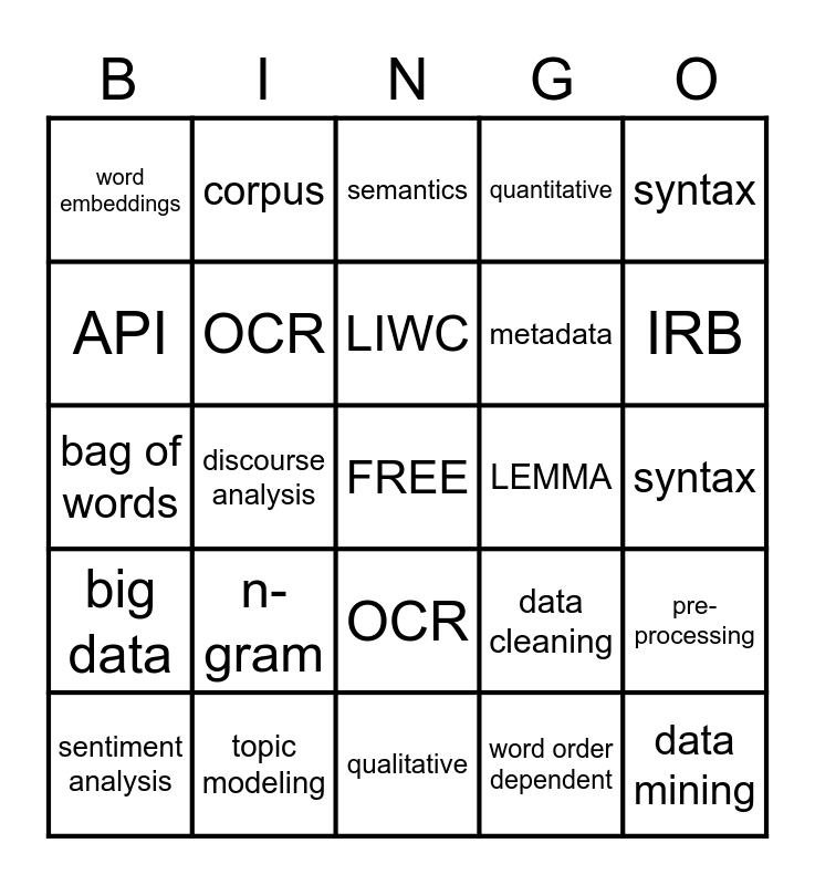 This bingo card has a free space and 24 words: n-gram, topic modeling, LIWC, sentiment analysis, syntax, word embeddings, API, corpus, LEMMA, OCR, metadata, bag of words, data cleaning, pre-processing, OCR, word order dependent, syntax, semantics, IRB, discourse analysis, data mining, big data, quantitative and qualitative.