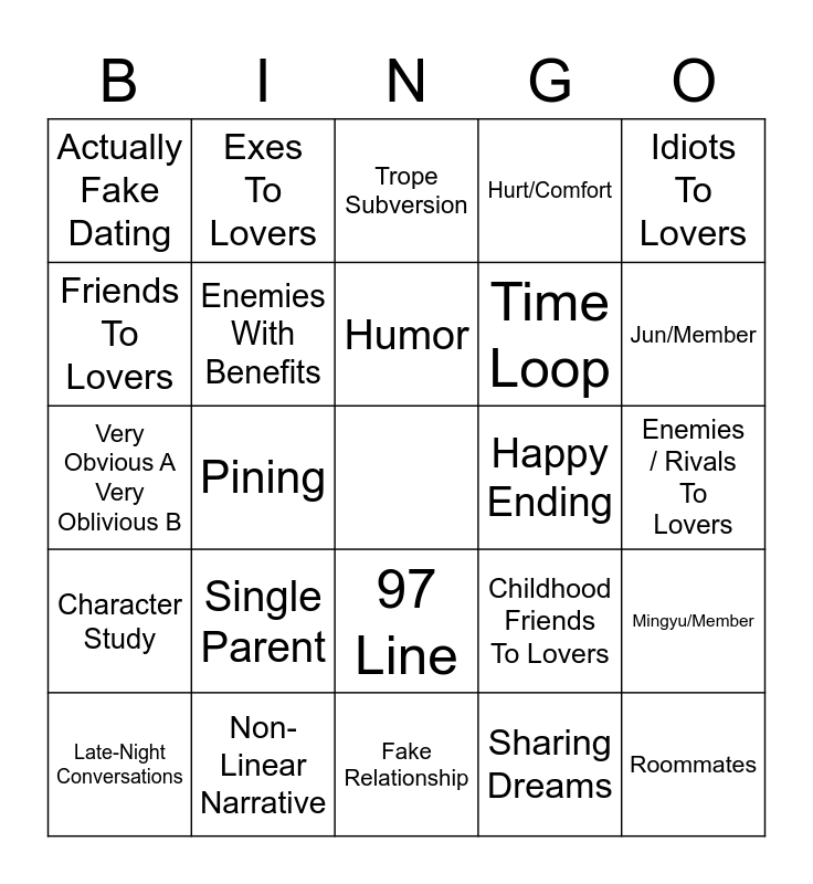 This bingo card has a free space and 73 words: 3+1 / 5+1 Things, Acts Of Service, Actually Fake Dating, Angst With A Happy Ending, Banter / Bickering, Based On Other Media, Character Study, Childhood Friends, Childhood Friends To Lovers, Confessions, Didn't Know They Were Dating, Domesticity, Enemies With Benefits, Enemies / Rivals To Lovers, Established Relationship, Exes To Lovers, Fake Relationship, Friends To Lovers, Friends With Benefits, Happy Ending, Humor, Hurt/Comfort, Idiots To Lovers, Jealousy, Late-Night Conversations, Love Languages, Marriage Of Convenience, Meddling / Matchmaking, Mutual Pining, No One Believes They're Dating, Non-Linear Narrative, Not Actually Unrequited Love, Only One Bed, Opposites Attract, Pining, Polyamory, Professional Partners To Lovers, Right Person Wrong Time, Roommates, Secret Relationship, Sharing Dreams, Single Parent, Slice Of Life, Slow Burn, Stuck Together / Forced Proximity, Time Loop, Trope Subversion, Unrequited Love, Unrequited Rivalry, Very Obvious A Very Oblivious B, We Kissed Once But We Don't Talk About It, Wound Tending, Monogamous Relationship, Poly Relationship, OT13, 95 Line, 96 Line, 97 Line, Maknae Line, Leaders, Seungcheol/Member, Jeonghan/Member, Joshua/Member, Jun/Member, Hoshi/Member, Wonwoo/Member, Woozi/Member, Dokyeom/Member, Mingyu/Member, Minghao/Member, Seungkwan/Member, Vernon/Member and Dino/Member.