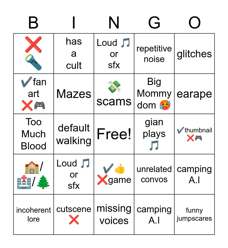 This bingo card has a free space and 24 words: Loud 🎵 or sfx, cutscene ❌, 💸scams, incoherent lore, glitches, ❌🔦, ✔️fan art ❌🎮, has a cult, gian plays 🎵, ✔️👍❌game, Big Mommy dom 🥵, Too Much Blood, unrelated convos, camping A.I, Mazes, camping A.I, ✔️thumbnail ❌🎮, Loud 🎵 or sfx, earape, default walking, funny jumpscares, 🏫/🏥/🌲, repetitive noise and missing voices.