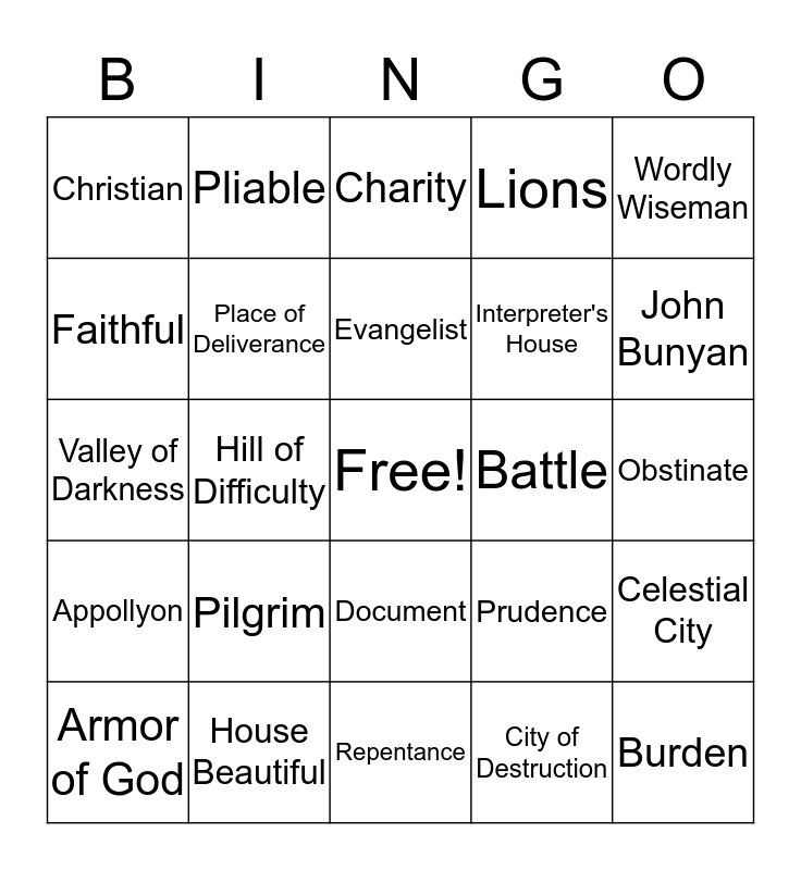 This bingo card has a free space and 24 words: Pilgrim, House Beautiful, Evangelist, Armor of God, Wordly Wiseman, Christian, Faithful, Pliable, Battle, Document, Interpreter's House, Valley of Darkness, Prudence, Celestial City, Place of Deliverance, City of Destruction, Obstinate, Charity, John Bunyan, Hill of Difficulty, Burden, Appollyon, Lions and Repentance.