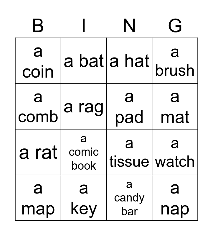 This bingo card has 16 words: a key, a watch, a hat, a coin, a rat, a bat, a tissue, a candy bar, a comb, a rag, a map, a brush, a comic book, a mat, a pad and a nap.