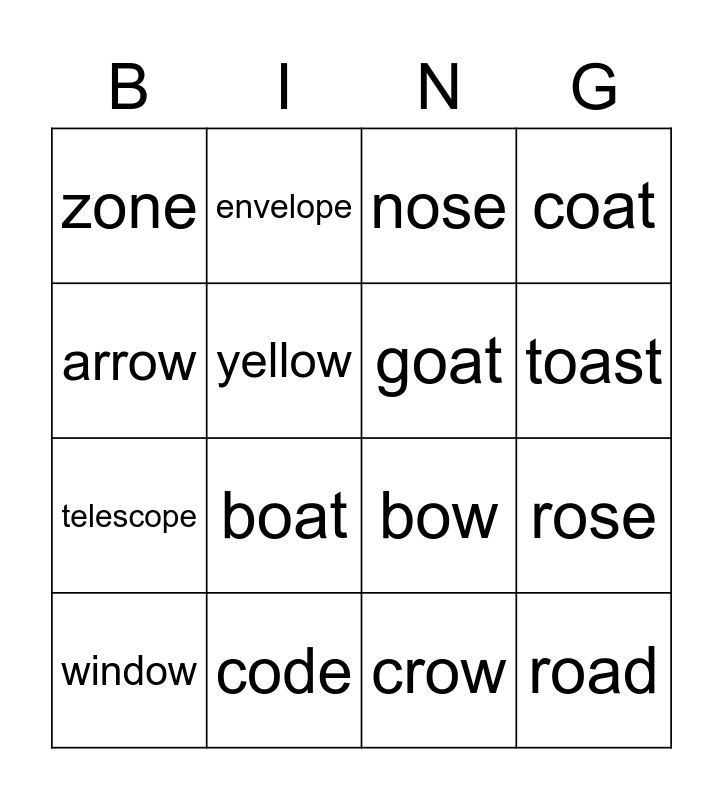 This bingo card has 16 words: code, rose, nose, zone, telescope, envelope, bow, crow, arrow, yellow, window, coat, boat, toast, goat and road.