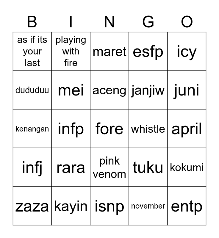 This bingo card has a free space and 24 words: rara, kayin, aceng, zaza, icy, as if its your last, dududuu, playing with fire, whistle, pink venom, janjiw, kenangan, tuku, kokumi, mei, november, april, maret, juni, infp, entp, infj, esfp and isnp.