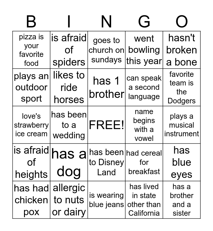 This bingo card has a free space and 24 words: has a dog, allergic to nuts or dairy, has 1 brother, has had chicken pox, hasn't broken a bone, pizza is your favorite food, plays an outdoor sport, is afraid of spiders, name begins with a vowel, has been to Disney Land, can speak a second language, love's strawberry ice cream, had cereal for breakfast, has blue eyes, likes to ride horses, has lived in state other than California, plays a musical instrument, goes to church on sundays, favorite team is the Dodgers, has been to a wedding, has a brother and a sister, is afraid of heights, went bowling this year and is wearing blue jeans.