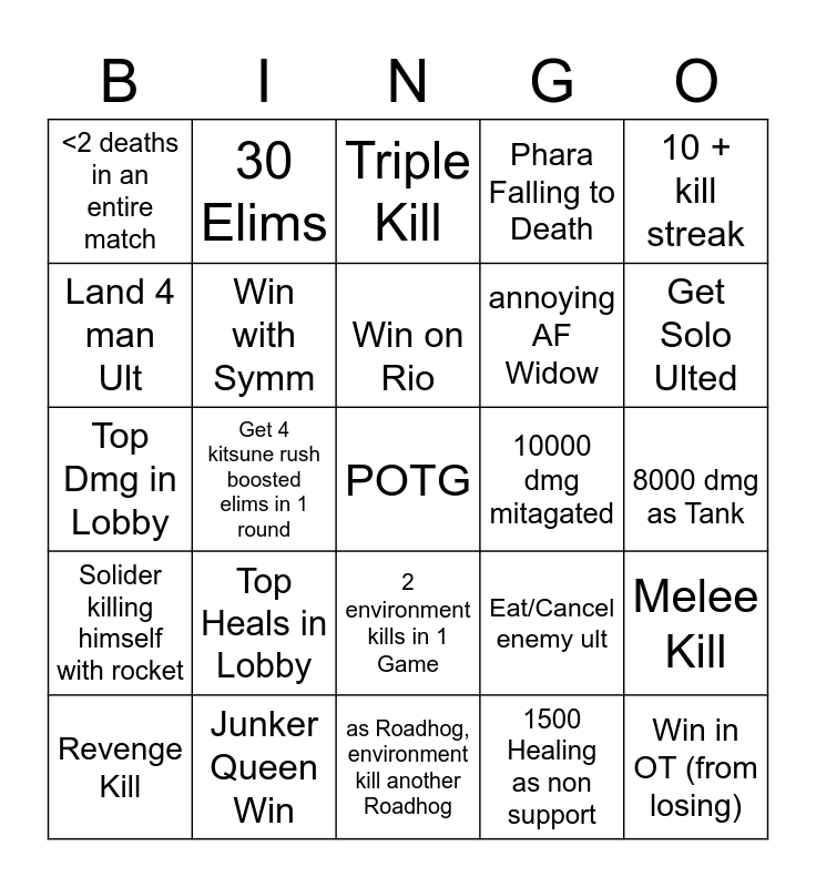 This bingo card has a free space and 24 words: Top Heals in Lobby, Junker Queen Win, Win on Rio, Revenge Kill, 10 + kill streak, <2 deaths in an entire match, Land 4 man Ult, 30 Elims, 10000 dmg mitagated, 2 environment kills in 1 Game, annoying AF Widow, Top Dmg in Lobby, Eat/Cancel enemy ult, Melee Kill, Win with Symm, 1500 Healing as non support, 8000 dmg as Tank, Triple Kill, Get Solo Ulted, Get 4 kitsune rush boosted elims in 1 round, Win in OT (from losing), Solider killing himself with rocket, Phara Falling to Death and as Roadhog, environment kill another Roadhog.