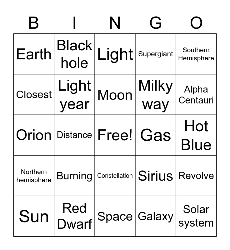 This bingo card has a free space and 29 words: Sun, Stars, Distance, Brightness, Earth, Light, Light year, Burning, Gas, Red Dwarf, Hot Blue, Solar system, Space, Galaxy, Alpha Centauri, Polaris, Constellation, Northern hemisphere, Southern Hemisphere, Orion, Sirius, Betelgeuse, Milky way, Closest, Supergiant, Black hole, Revolve, Moon and Eclipse.