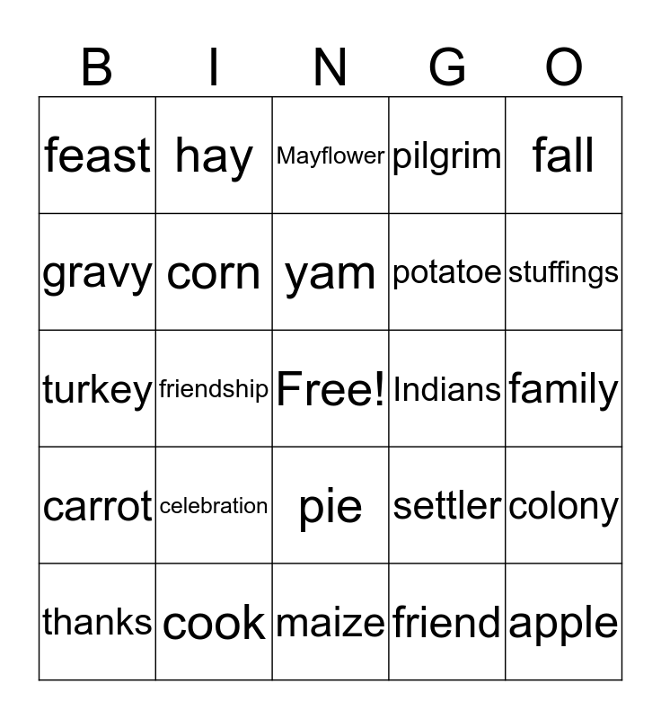 This bingo card has a free space and 24 words: celebration, cook, yam, thanks, fall, feast, gravy, hay, Indians, pie, potatoe, turkey, settler, colony, corn, friend, family, Mayflower, stuffings, friendship, apple, carrot, pilgrim and maize.