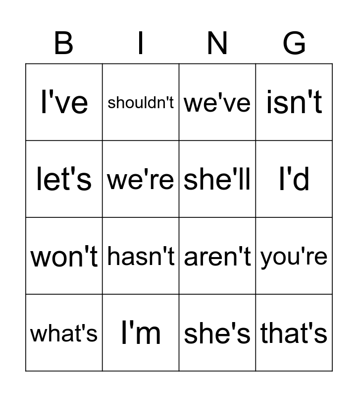 This bingo card has 16 words: I'm, you're, we've, I've, won't, shouldn't, aren't, she's, let's, we're, what's, isn't, hasn't, I'd, she'll and that's.