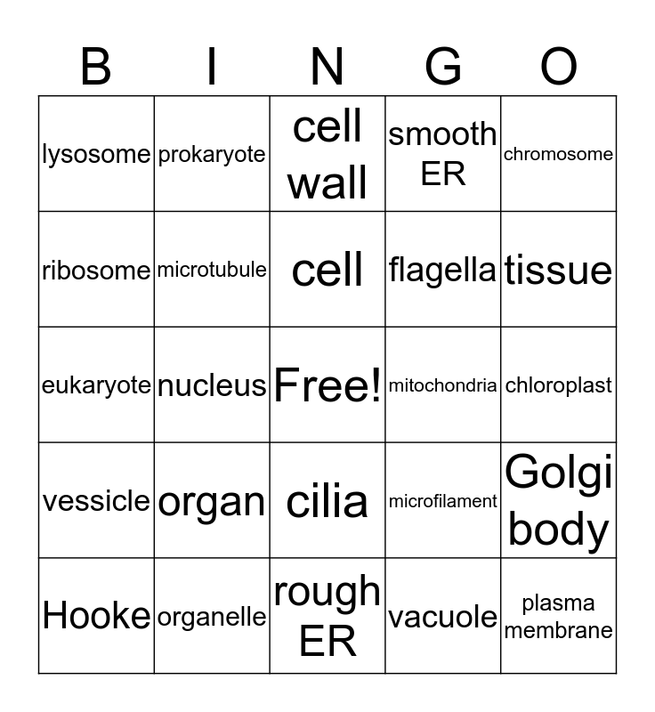 This bingo card has a free space and 24 words: organ, organelle, cell, Hooke, chromosome, lysosome, ribosome, prokaryote, mitochondria, cilia, flagella, eukaryote, microfilament, Golgi body, microtubule, vacuole, chloroplast, cell wall, tissue, nucleus, plasma membrane, vessicle, smooth ER and rough ER.
