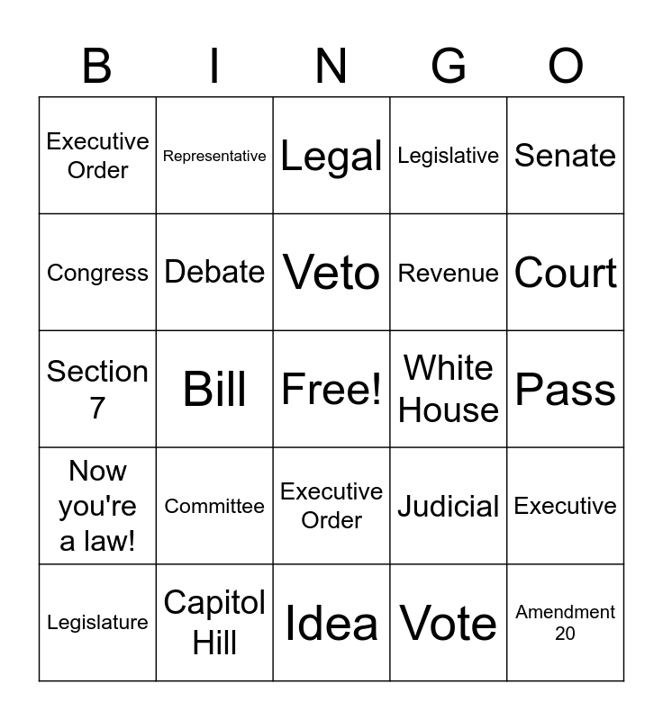 This bingo card has a free space and 24 words: Committee, Capitol Hill, Veto, Legislature, Senate, Executive Order, Congress, Representative, White House, Executive Order, Revenue, Section 7, Judicial, Executive, Debate, Vote, Pass, Legal, Court, Bill, Amendment 20, Now you're a law!, Legislative and Idea.