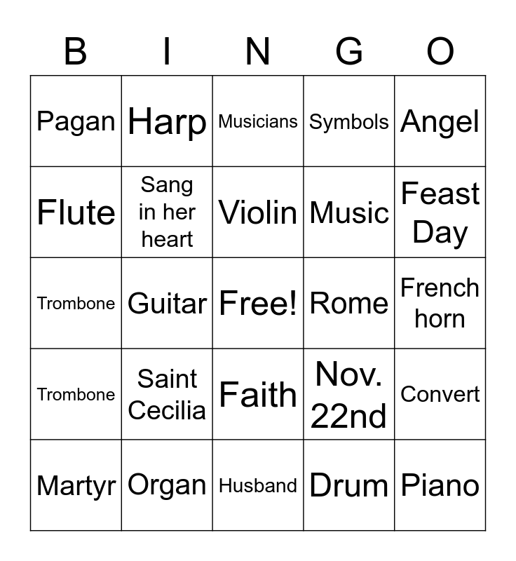 This bingo card has a free space and 24 words: Saint Cecilia, Organ, Violin, Martyr, Angel, Pagan, Flute, Harp, Rome, Faith, Music, Trombone, Nov. 22nd, Convert, Sang in her heart, Drum, French horn, Musicians, Feast Day, Guitar, Piano, Trombone, Symbols and Husband.