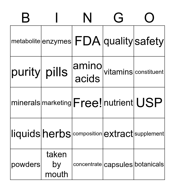 This bingo card has a free space and 24 words: herbs, taken by mouth, amino acids, powders, safety, metabolite, purity, enzymes, nutrient, composition, vitamins, minerals, extract, supplement, pills, capsules, USP, FDA, constituent, marketing, botanicals, liquids, quality and concentrate.