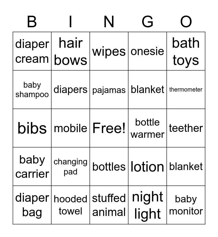 This bingo card has a free space and 29 words: diaper bag, burp cloth, mobile, bath tub, diaper cream, wipes, diapers, changing pad, bottle warmer, hooded towel, teether, baby monitor, stuffed animal, night light, thermometer, pacifier, bottles, baby carrier, bath toys, bibs, lotion, crib sheets, blanket, baby shampoo, onesie, hair bows, blanket, pajamas and play mat.