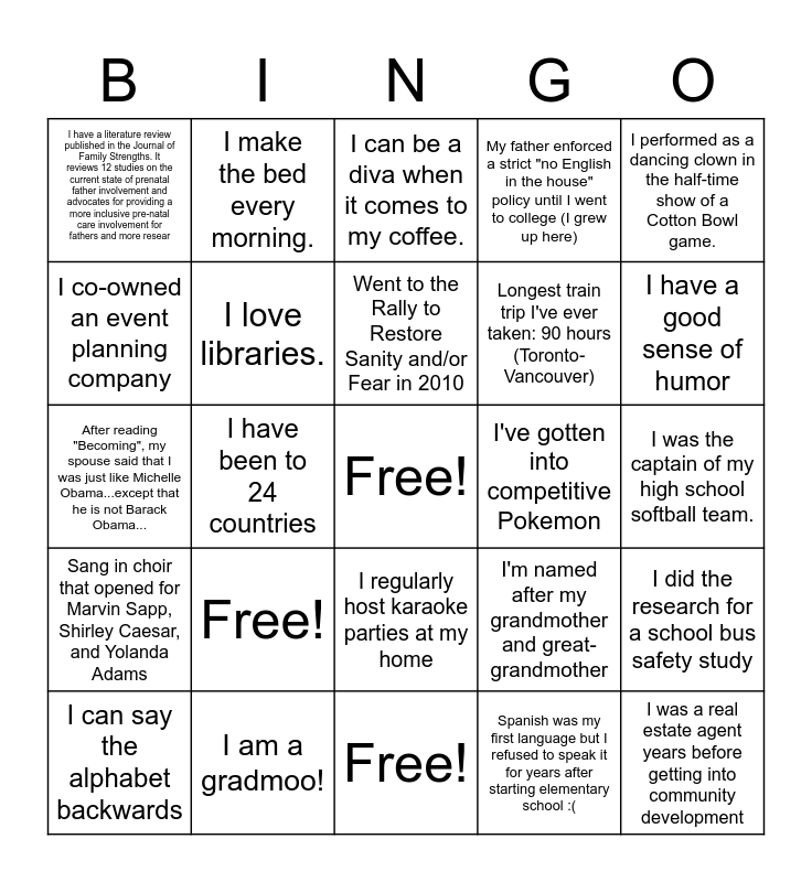 This bingo card has a free space and 24 words: Free!, I am a gradmoo!, Went to the Rally to Restore Sanity and/or Fear in 2010, I can say the alphabet backwards, I performed as a dancing clown in the half-time show of a Cotton Bowl game., I have a literature review published in the Journal of Family Strengths. It reviews 12 studies on the current state of prenatal father involvement and advocates for providing a more inclusive pre-natal care involvement for fathers and more resear, I co-owned an event planning company, I make the bed every morning., I've gotten into competitive Pokemon, I regularly host karaoke parties at my home, Longest train trip I've ever taken: 90 hours (Toronto-Vancouver), After reading "Becoming", my spouse said that I was just like Michelle Obama...except that he is not Barack Obama..., I'm named after my grandmother and great-grandmother, I did the research for a school bus safety study, I love libraries., Spanish was my first language but I refused to speak it for years after starting elementary school :(, I was the captain of my high school softball team., I can be a diva when it comes to my coffee., I have a good sense of humor, I have been to 24 countries, I was a real estate agent years before getting into community development, Sang in choir that opened for Marvin Sapp, Shirley Caesar, and Yolanda Adams, My father enforced a strict "no English in the house" policy until I went to college (I grew up here) and Free!.