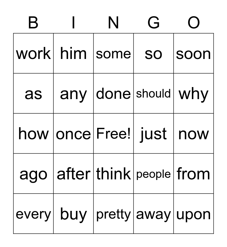 This bingo card has a free space and 24 words: after, buy, done, every, soon, work, as, him, just, think, should, how, people, from, any, away, now, some, why, once, upon, ago, so and pretty.