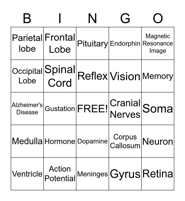 This bingo card has a free space and 24 words: Hormone, Action Potential, Reflex, Ventricle, Magnetic Resonance Image, Parietal lobe, Occipital Lobe, Frontal Lobe, Cranial Nerves, Dopamine, Vision, Alzheimer's Disease, Corpus Callosum, Neuron, Spinal Cord, Gyrus, Soma, Pituitary, Memory, Gustation, Retina, Medulla, Endorphin and Meninges.
