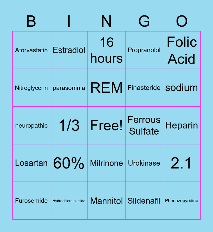 This bingo card has a free space and 54 words: Captopril, Losartan, Diltiazem, Digoxin-, Milrinone, Lidocaine, Propranolol, Amiodarone, Nitroglycerin, Cholestyramine, Atorvastatin, Ezetimibe, Hydrochlorothiazide, Furosemide, Spironolactone, Mannitol, Phenazopyridine, Finasteride, Aspirin, Heparin, Urokinase, Epoetin alpha, Ferrous Sulfate, Folic Acid, Hydroxocobalamin, Estradiol, Northindrone acetate, Oxytocin, Testosterone, Sildenafil, 15-35, 148, 6 rights of med admin, 4-6 cycles, 16 hours, true, neuropathic, 2.1, swell, parasomnia, fast myelinated A-delta fibers, positive, sodium, NREM, 60%, 6-8½, pin needles, Atrial Natriuretic Peptide, REM, 1/3, sodium, hypovolemia, kidney and hypothalamus.