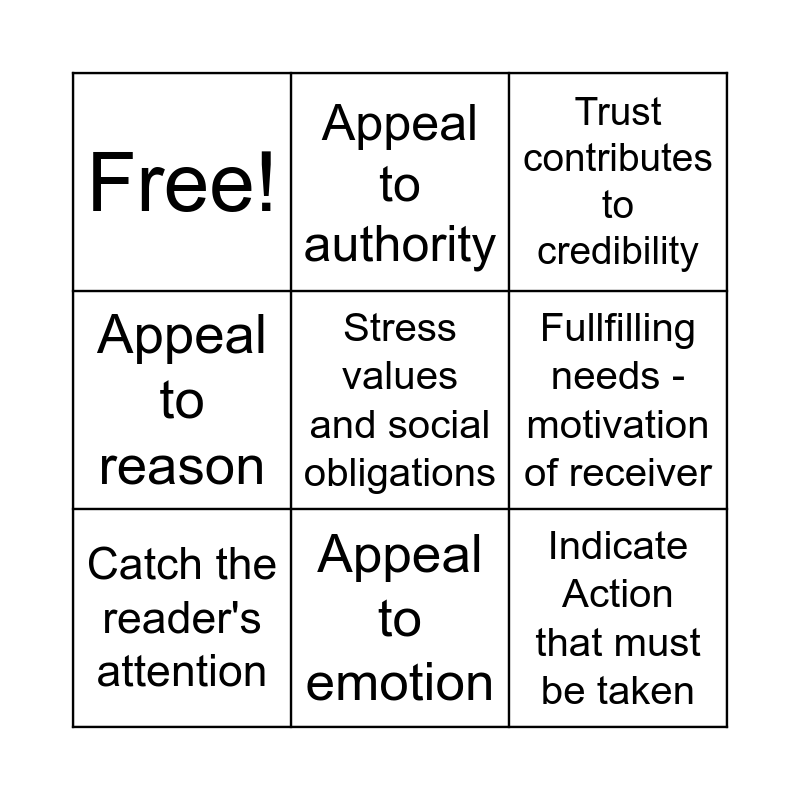 This bingo card has 9 words: Catch the reader's attention, Trust contributes to credibility, Appeal to authority, Appeal to reason, Free!, Fullfilling needs - motivation of receiver, Stress values and social obligations, Indicate Action that must be taken and Appeal to emotion.