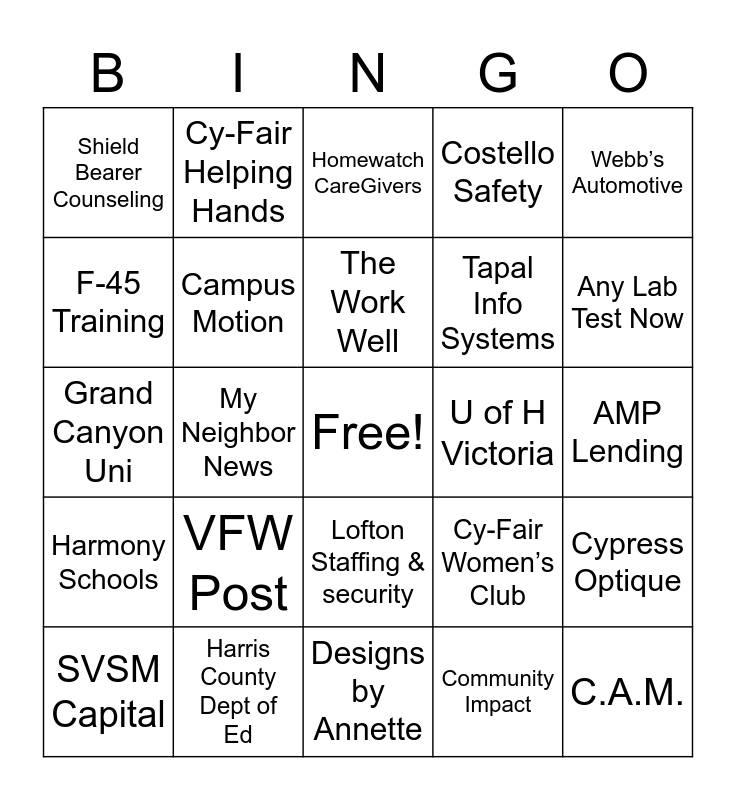 This bingo card has a free space and 30 words: Harris County Dept of Ed, Smile Doctors, My Neighbor News, Cy-Fair Federal Credit Union, Shield Bearer Counseling, Homewatch CareGivers, Campus Motion, Lofton Staffing & security, U of H Victoria, Designs by Annette, AMP Lending, C.A.M., Community Impact, Brookside Funeral Homes, Any Lab Test Now, Family Tree Chiro, Cy-Fair Women’s Club, Harmony Schools, VFW Post, Webb’s Automotive, Grand Canyon Uni, Ray Family Therapy, Cy-Fair Helping Hands, Tapal Info Systems, F-45 Training, Costello Safety, Cypress Optique, SVSM Capital, The Work Well and Huntington Learning.