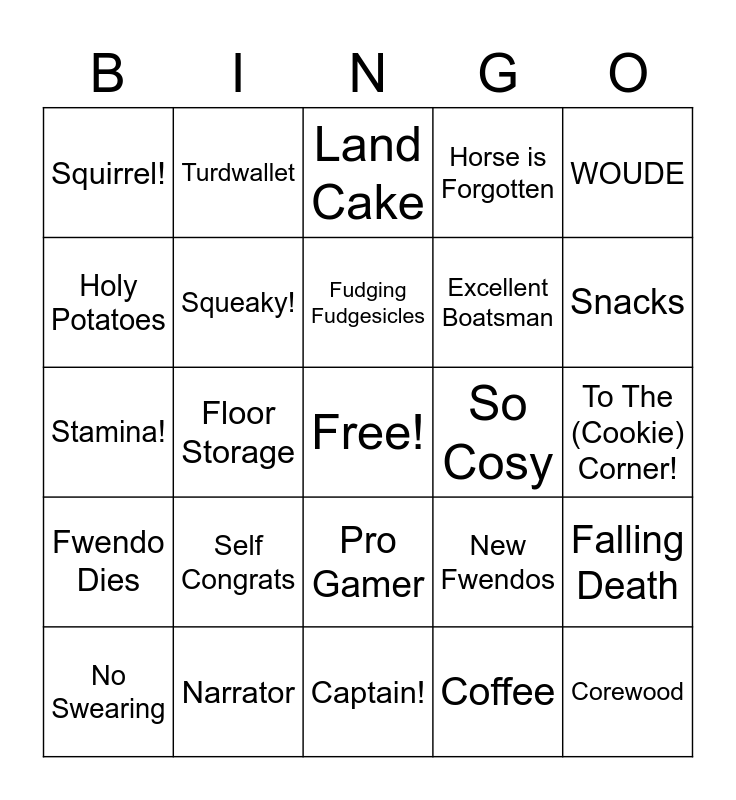 This bingo card has a free space and 30 words: Narrator, French Accent, Floor Storage, The real boss is ___, Squirrel!, Land Cake, Squeaky!, Pro Gamer, So Cosy, Captain!, To The (Cookie) Corner!, Corewood, Coffee, Conan, Snacks, Poos and Wees, New Fwendos, Fwendo Dies, Self Congrats, WOUDE, Stamina!, Screenshots, Turdwallet, Excellent Boatsman, Holy Potatoes, Horse is Forgotten, Falling Death, No Swearing, Fudging Fudgesicles and Bloobs.