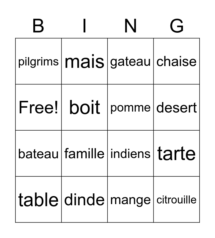 This bingo card has 16 words: dinde, tarte, gateau, pilgrims, bateau, mais, indiens, mange, Free!, boit, table, chaise, famille, desert, pomme and citrouille.