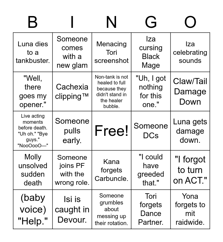 This bingo card has a free space and 30 words: Isi is caught in Devour., Someone runs out of food and/or pots, Someone pulls early., Someone's food runs out, Luna dies to a tankbuster., Menacing Tori screenshot, Cachexia clipping™, Kana forgets Carbuncle., Someone DCs, Someone grumbles about messing up their rotation., Luna gets damage down., Yona forgets to mit raidwide., Tori forgets Dance Partner., Isi pulls early., Claw/Tail Damage Down, Last resort: Freebird, "I could have greeded that.", Molly unsolved sudden death, Someone joins PF with the wrong role., Iza celebrating sounds, Live acting moments before death. "Uh oh." "Bye guys." "NooOooO—", Yona calls the wrong safe spot., Someone comes with a new glam, "Uh, I got nothing for this one.", "Well, there goes my opener.", Iza cursing Black Mage, "I forgot to turn on ACT.", (baby voice) "Help.", Non-tank is not healed to full because they didn't stand in the healer bubble. and Someone dies to knockback.