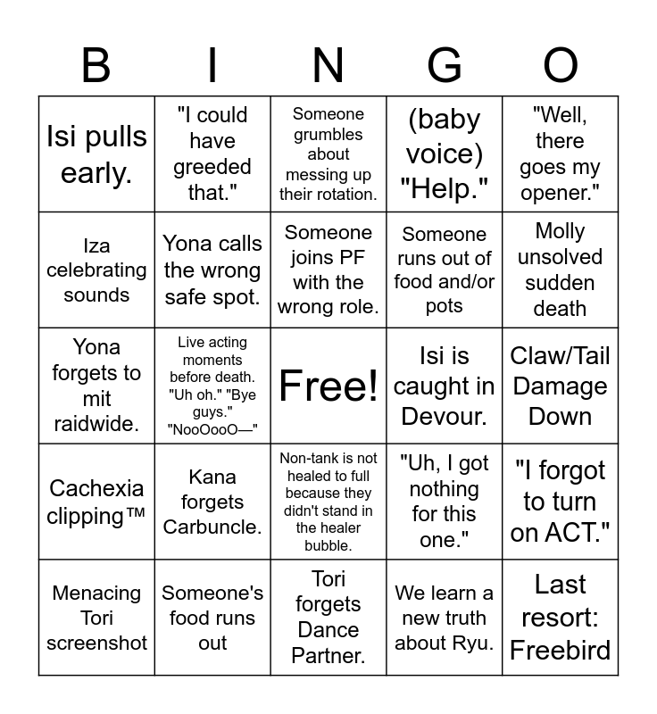 This bingo card has a free space and 30 words: Someone's food runs out, Someone pulls early., Live acting moments before death. "Uh oh." "Bye guys." "NooOooO—", Someone dies to knockback, Isi pulls early., Someone grumbles about messing up their rotation., Yona calls the wrong safe spot., Non-tank is not healed to full because they didn't stand in the healer bubble., Isi is caught in Devour., Tori forgets Dance Partner., Claw/Tail Damage Down, Last resort: Freebird, We learn a new truth about Ryu., Someone comes with a new glam, Molly unsolved sudden death, Someone DCs, "Uh, I got nothing for this one.", Cachexia clipping™, Kana forgets Carbuncle., "Well, there goes my opener.", Yona forgets to mit raidwide., Iza cursing Black Mage, "I could have greeded that.", Someone runs out of food and/or pots, Iza celebrating sounds, (baby voice) "Help.", "I forgot to turn on ACT.", Menacing Tori screenshot, Someone joins PF with the wrong role. and Ryu strips..