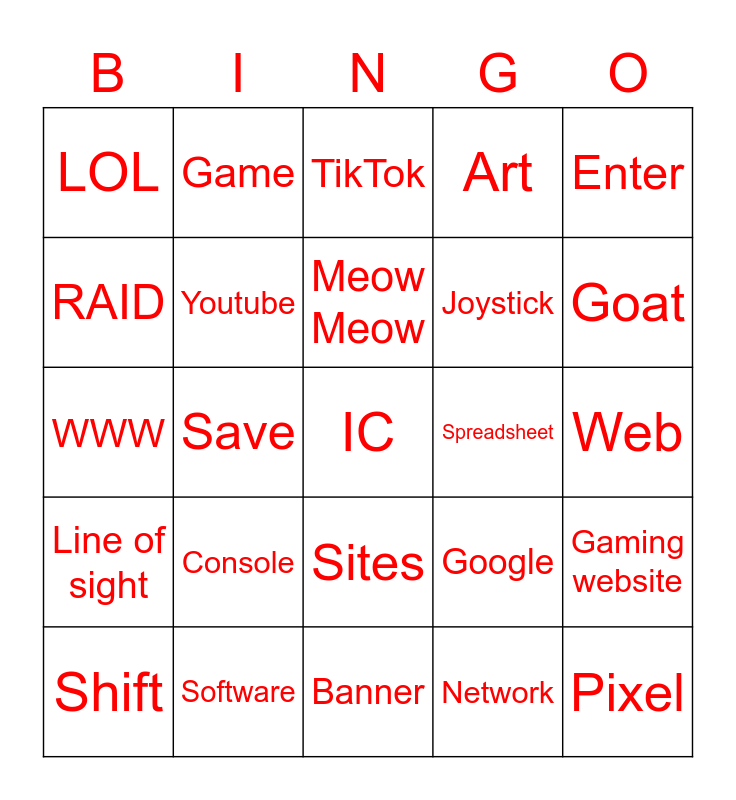This bingo card has 25 words: Line of sight, Software, IC, Network, Enter, LOL, Game, TikTok, Spreadsheet, Gaming website, RAID, Youtube, Banner, Google, Goat, Shift, Save, Meow Meow, Joystick, Web, WWW, Console, Sites, Art and Pixel.