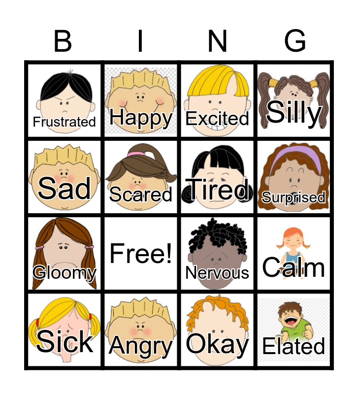 This bingo card has 15 images and 16 words: Angry, Calm, Excited, Frustrated, Gloomy, Happy, Nervous, Okay, Sad, Scared, Sick, Silly, Free!, Surprised, Tired and Elated.