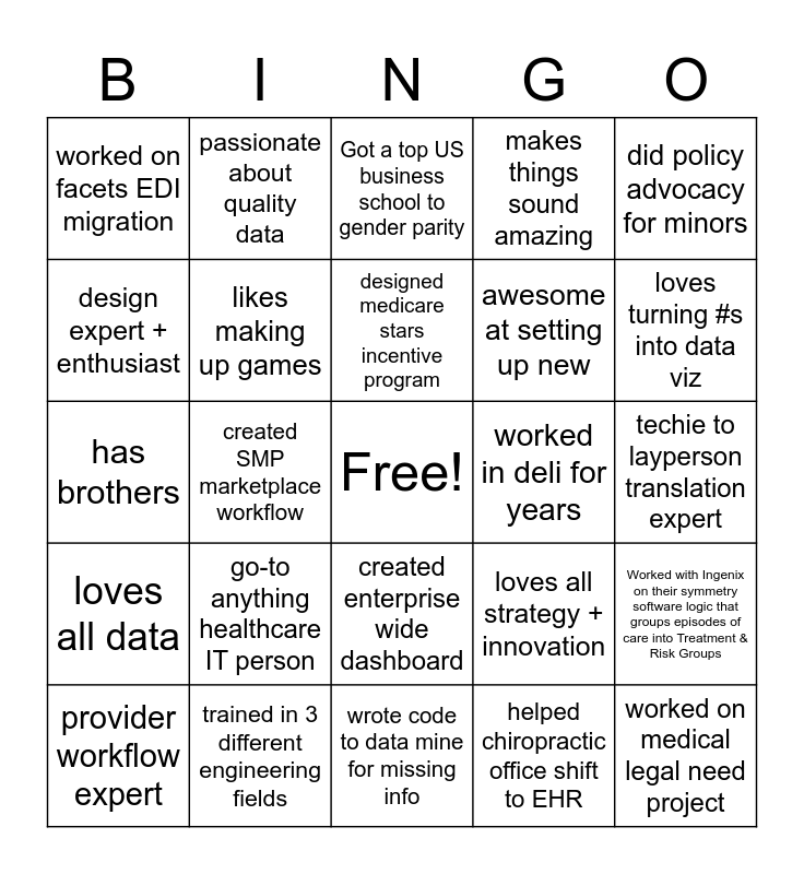 This bingo card has a free space and 29 words: provider workflow expert, go-to fixer, created SMP marketplace workflow, lectured at UCSF school of nursing, worked on facets EDI migration, Got a top US business school to gender parity, likes making up games, go-to anything healthcare IT person, worked in deli for years, trained in 3 different engineering fields, techie to layperson translation expert, worked on medical legal need project, wrote code to data mine for missing info, helped chiropractic office shift to EHR, loves turning #s into data viz, is left-handed, created enterprise wide dashboard, loves all data, did policy advocacy for minors, has brothers, loves all strategy + innovation, worked in biochem lab analyzing human feces, awesome at setting up new, design expert + enthusiast, makes things sound amazing, passionate about quality data, Worked with Ingenix on their symmetry software logic that groups episodes of care into Treatment & Risk Groups, designed medicare stars incentive program and excel guru for anything except pivot tables.