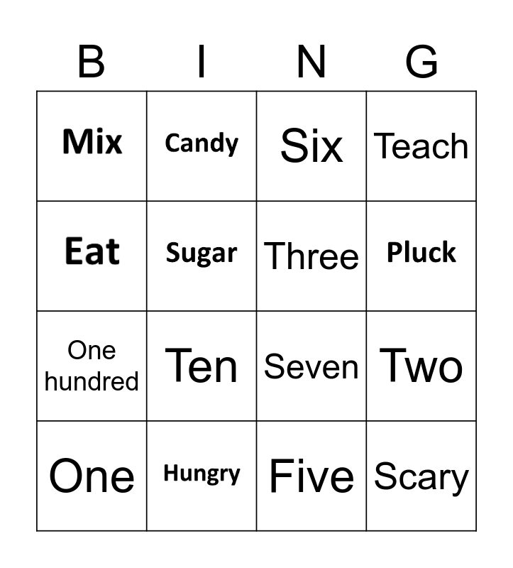 This bingo card has 9 images and 16 words: Banana, One hundred, Seven, Nine, Eight, Three, Four, Five, Six, Ten, Two, One, Funny, Scary, Teach and Think.