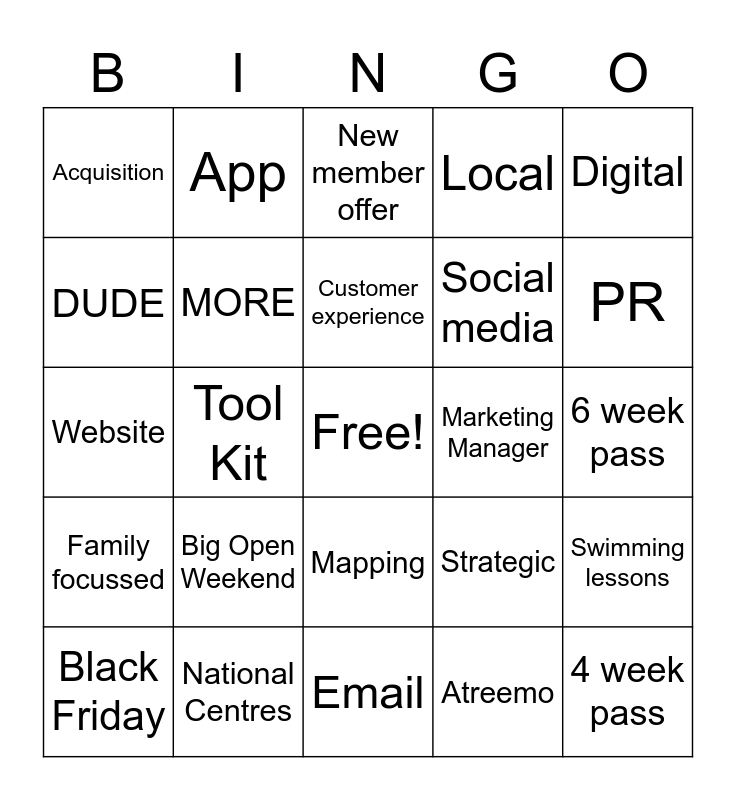 This bingo card has a free space and 36 words: Customer, Commercial, MORE brand, MORE, Strategic, Family focussed, Customer experience, Deliver, Digital, Campaign, Tool Kit, Local, National, Marketing Manager, PR, Acquisition, Fit Together, Big Open Weekend, 4 week pass, New member offer, 6 week pass, Swimming lessons, National Centres, Black Friday, Email, App, Website, Localisation, Social media, DUDE, Engagement, Single customer view, Atreemo, Mapping, Surveys and Internal comms.