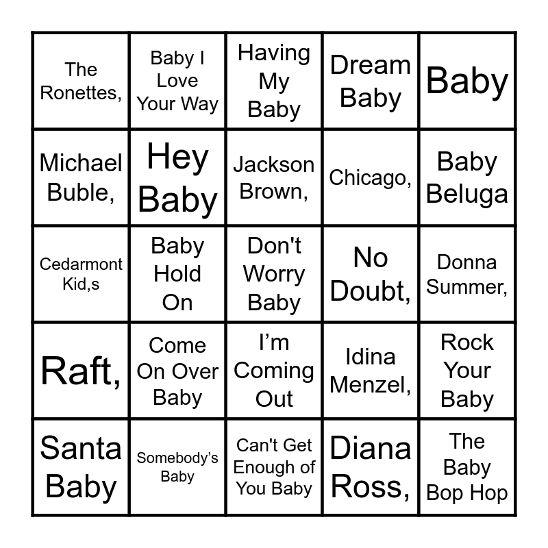 This bingo card has 84 words: Baby I'm A Want You, Bread,, Having My Baby, Paul Anka, Ice Ice Baby, Vanilla Ice,, Hit Me Baby One More Time, Britney Spears,, I Got You Babe, Sonny & Cher,, Baby Shark, Pinkfong,, Hey Baby, No Doubt,, Be My Baby, The Ronettes,, Santa Baby, Michael Buble,, Baby Got Back, Sir Mix A Lot,, Baby What a Big Surprise, Chicago,, Don't Worry Baby, The Beach Boys,, Baby Hold On, Eddie Money,, Baby Come, Back Player,, Doing It All For My Baby, Huey Lewis,, Come On Over Baby, Christina Aguilera,, Baby Bumble Bee, Cedarmont Kid,s, The Baby Bop Hop, Barney,, Can't Get Enough of You Baby, Smash Mouth,, Baby Beluga, Raft,, Baby I Need Your Loving, The Four Tops,, Runaway Baby, Bruno Mars,, Baby Love, The Supremes,, Baby I Love Your Way, Peter Frampton,, Always Be My Baby, Mariah Carey,, Baby Its Cold Outside, Idina Menzel,, Dream Baby, Roy Orbison,, Star Baby, The Guess Who,, Somebody’s Baby, Jackson Brown,, Love to Love You Baby, Donna Summer,, Isn’t She Lovely, Stevie Wonder,, Push It, Salt n Pepa,, Baby Face, Little Richard,, Ooo Baby Baby, The Miracles,, Baby, Justin Bieber,, Rock Your Baby, George McCrae,, Take Good Care of My Baby, Bobby Vee,, I’m Coming Out, Diana Ross,, Give It To Me Baby, Rick James,, Under Pressure, Queen,, Hurts so Good, John Couger,, Baby Baby and Amy Grant,.