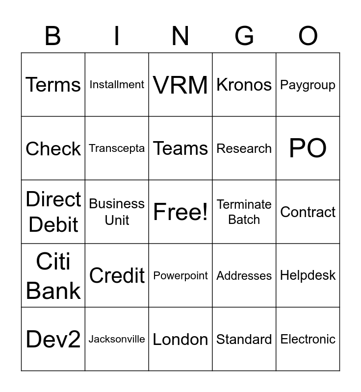This bingo card has a free space and 74 words: Cloud, Invoice, VRM, Coding, Supplier, EPPE, Preapproved, Kordoba, Dev2, Close, Pontoon, Upload, Teams, Check, Clearing, Business Unit, OTBI, PO, Prolease, Direct Debit, Transcepta, Installment, Kronos, EBS, Electronic, Virtual Card, TRN, Remit-to, Due Date, Vendor Listing, Paygroup, Aging, Holds, CFT, Credit Memo, Standard, Prepayment, Dev5, ARCS, Recon, London, Jacksonville, Pune, Frankfurt, Gurgaon, Terms, Debit, Credit, BUC, Workflow, Intranet, Email, Contract, Corporate, T&E, Excel, Powerpoint, 8x8, Mailbox, Helpdesk, Research, Bank of America, Citi Bank, Requisition, Terminate Batch, Expenses, Site, Creation Date, Addresses, Payments, Bank Account, Status, EMEA and APAC.