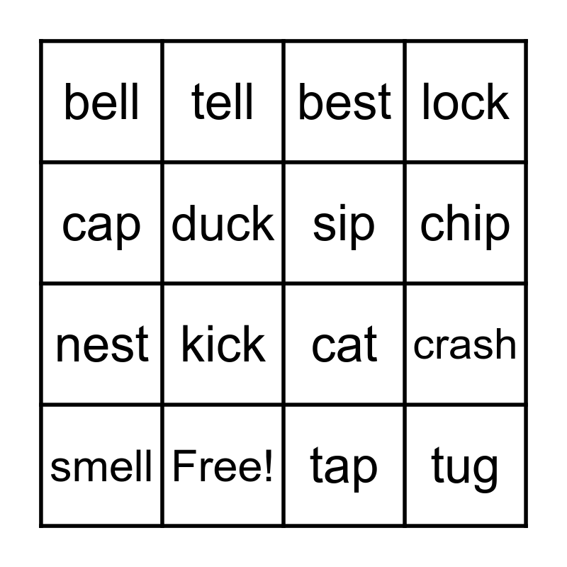 This bingo card has 24 words: fat, stick, chip, bug, cap, bell, duck, tell, Free!, cash, nest, cat, mash, brick, sip, mug, tap, best, kick, crash, smell, tug, lock and stuck.