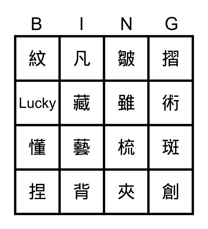 This bingo card has 16 words: 背, 斑, 皺, 紋, 懂, 凡, 梳, 夾, Lucky, 藏, 捏, 摺, 藝, 術, 雖 and 創.