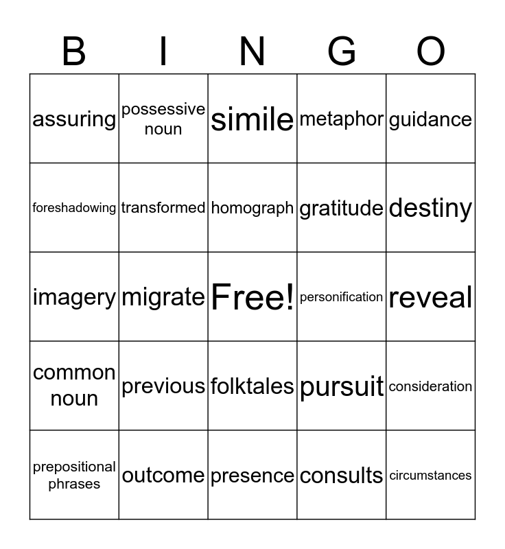 This bingo card has a free space and 24 words: previous, outcome, homograph, prepositional phrases, guidance, assuring, foreshadowing, possessive noun, personification, folktales, gratitude, imagery, pursuit, consideration, transformed, consults, reveal, simile, destiny, migrate, circumstances, common noun, metaphor and presence.