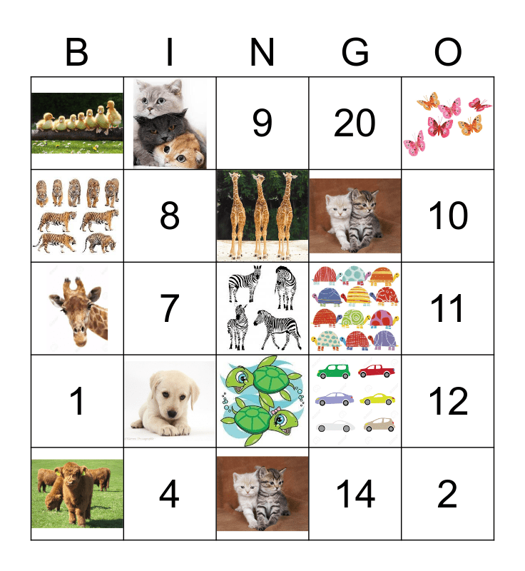 This bingo card has 14 images and 11 words: 12, 8, 2, 11, 9, 10, 7, 4, 1, 20 and 14.
