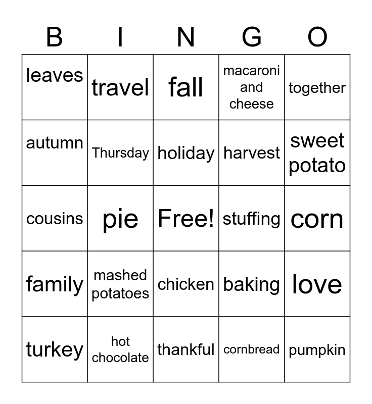 This bingo card has a free space and 29 words: turkey, gravy, pie, football, leaves, fall, Thursday, mashed potatoes, stuffing, hot chocolate, corn, pumpkin, thankful, cornbread, sweet potato, ham, chicken, family, together, cousins, baking, feast, harvest, autumn, macaroni and cheese, travel, love, holiday and meal.