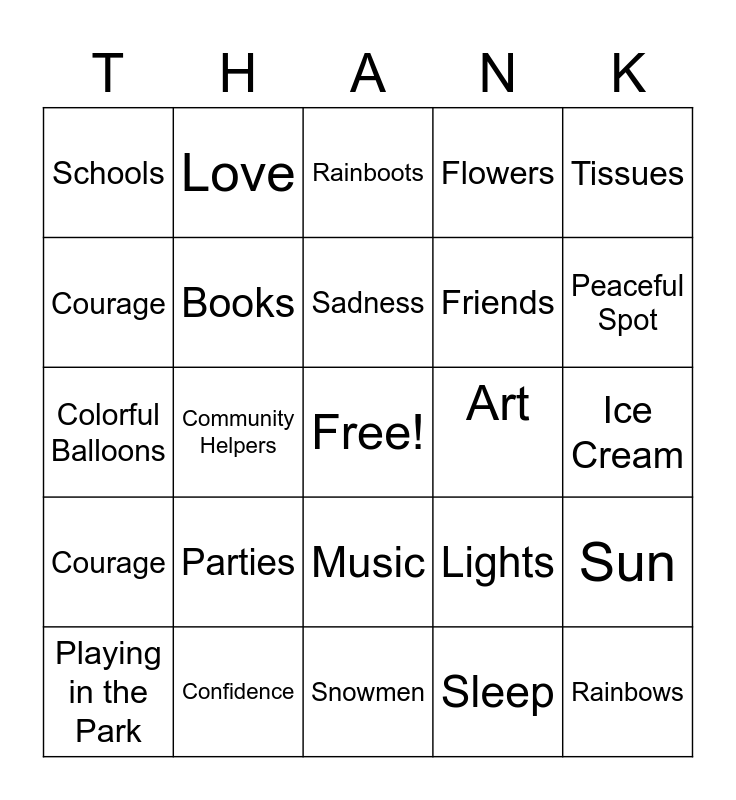 This bingo card has a free space and 29 words: Playing in the Park, Teachers, Community Helpers, Family, Schools, Rainboots, Books, Parties, Art, Confidence, Ice Cream, Rainbows, Snowmen, Sleep, Peaceful Spot, Anger, Music, Courage, Tissues, Colorful Balloons, Lights, Hats, Friends, Courage, Flowers, Love, Sun, Sadness and Cake.