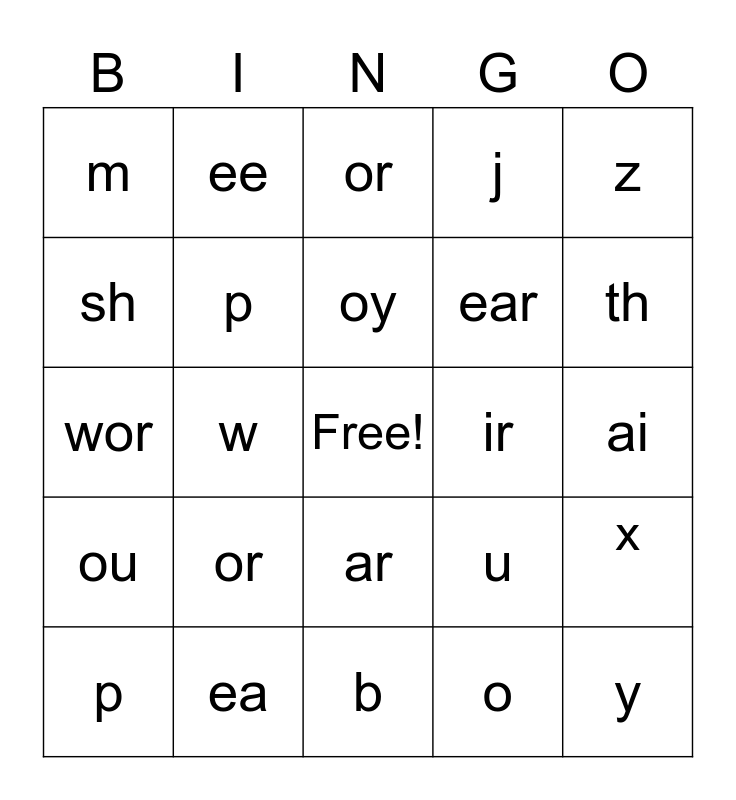 This bingo card has a free space and 24 words: or, ea, oy, p, z, m, sh, ee, ir, ar, ear, wor, u, x, p, o, ai, or, th, w, y, ou, j and b.
