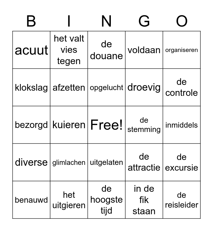 This bingo card has a free space and 24 words: glimlachen, het uitgieren, opgelucht, benauwd, organiseren, acuut, klokslag, het valt vies tegen, de stemming, uitgelaten, droevig, bezorgd, de attractie, de excursie, afzetten, in de fik staan, inmiddels, de douane, de controle, kuieren, de reisleider, diverse, voldaan and de hoogste tijd.