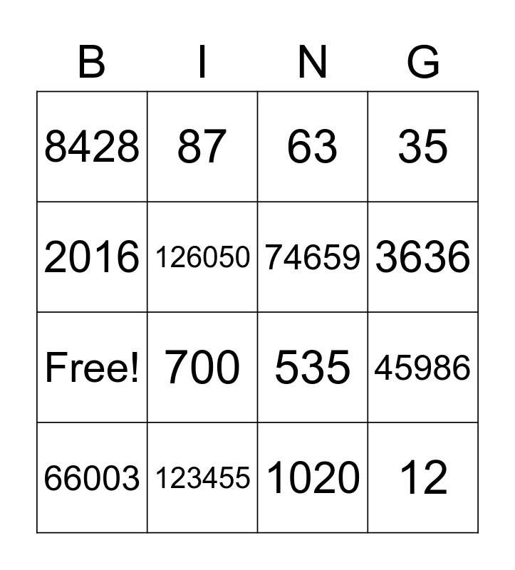 This bingo card has 20 words: 45986, 10000, 63, 785, 66003, 2016, 123455, 8428, Free!, 87, 700, 535, 126050, 12, 74659, 1500, 3636, 35, 1020 and 664.
