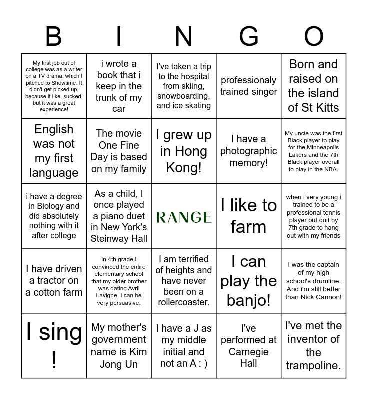 This bingo card has a free space and 137 words: I never learned to ride a bike, I enjoy cooking, I was the drummer for my College's Musical Theater Band!, actual favorite food is Goldfish & I've never seen The Lion King or Titanic., I helped 3,000 students get into college, I trained as a classical violinist growing up., I have a J as my middle initial and not an A : ), When I was 12 years old I broke my hip on a boat, I broke my wrist falling off a ladder, I've had 4 different citizenships in my lifetime, I have 2 first names, I am career driven, I am huge country music fan, I love traveling and have been to Europe a number of times., My high school drum line marched in the NYC St. Patrick's Day Parade, but one year we ran out of drums, so I played the cowbell for 30 blocks on 5th Ave., My grandmother was part of the team at Bletchley park that broke the Enigma code in WW2, I played violin for 10 years in a classical Persian orchestra, I’ve lived in 8 different cities and 3 countries., As a child, I once played a piano duet in New York's Steinway Hall, Rob Whittel and I went to the same high school and his mom taught my Spanish Class, One of my favorite hobbies is stand up paddle boarding., I love the piano, Me and my sister used to run the Quiet Riot fan club in the early '80., Brewing beer is a hobby of mine, My first job out of college was as a writer on a TV drama, which I pitched to Showtime. It didn't get picked up, because it like, sucked, but it was a great experience!, previous Team USA figure skater, I am a dual citizen of the US and Germany., Born and raised on the island of St Kitts, My grandpa came up with the name for "Taco Bell"., I was a division 1 college diver for a year., I was born in The Bahamas, grew up in Jamaica, have a Haitian last name but my dad is from The Turks Cacois Islands. I am a true representation of Miss Caribbean!, I am a small business owner-- I create merch for sororities and fraternities, I have driven a tractor on a cotton farm, My mother's government name is Kim Jong Un, I have no cartilage in my nose, I like to sing and play ukulele, I was inexplicably responsible for AV at the Second Annual Range Retreat, if I wasn't a representative, I would be a coach/teacher, I'm left-handed, I made a wrote and produced a web series when i was an assistant at CAA. And without my boss' knowledge or permission, i called one of his clients and asked him to star in it. He did. And he is now my client., I served the first ever Quiznos sandwhich in Connecticut ", I lived in China for two months running an assembly line., I grew up in Hong Kong!, I am ridiculously talented at Ping-Pong, Produced a feature doc about real men around the world named James Bond, I was trained as a biochemist and I took a night school degree in archaeology., I once caught a koala that fell out of a tree in Australia, I have a 160 lb St. Bernard named Bruce, Darby throws a birthday party for her dog, Duke every year, complete with merch, cake, and sometimes kegs of beer. It's called Dukefest., i have a degree in Biology and did absolutely nothing with it after college, i wrote a book that i keep in the trunk of my car, I'm 100% Greek, I ran the Los Angeles Marathon, I have a photographic memory!, I have a cameo in Justin Bieber's film "Never Say Never", When I had COVID, I shut down the most popular sandwich shop in my area, i was trained as a classical pianist for 15 years, I fostered 12 dogs during the first year of the pandemic, I am proficient in palmistry and tarot cards, I learned to juggle when I was 9., My karoke song is 'Justified & Ancient', I sing !, I am half black, which comes as a surprise to many!, I was captain of my high school Quiz Bowl team. We won state my junior year!, i won a game show because i needed the prize money to move to LA, I used to be a formally trained and licensed cake decorator., I love gardening, I've met the inventor of the trampoline., I am an Eagle Scout, Drove a tuktuk across India, I'm a first-generation American, Nearly Died from Lymes Disease, I am fluent in American Sign Language, I am terrified of heights and have never been on a rollercoaster., I can play the banjo!, I spent four months working with monkeys in Costa Rica, I 'married up' to an incredible woman, I'm a dad to two incredible little girls, and I have a passion for woodworking/building furniture., I have a twin, The movie One Fine Day is based on my family, I like to farm, I quite like Anchovies, I’ve taken a trip to the hospital from skiing, snowboarding, and ice skating, I have dual citizenship, my right foot is smaller then my left because i broke my ankle when i was 9, Music is in my blood! My Great-Grandfather was the first African-American to perform at Carnegie Hall and my Father was the lead singer for the first iteration of the now legendary band now known as Chic. A distinct trait about me is that Im ada, I was a musical theatre major at UC Irvine before I transferred to the University of Michigan, I know magic tricks, i was recently gifted a tractor for my pink country house., when i very young i trained to be a professional tennis player but quit by 7th grade to hang out with my friends, My first language was Spanish and I didn't learn English until I was 5, Spent a summer working in a Salmon packing plant in Kodiak, Alaska., Prince is from my home town, I had a self portrait I drew on display in an art museum when I was in high school, I was the captain of my high school's drumline. And i'm still better than Nick Cannon!, If I were good at science growing up it’s likely I’d have ended up studying animals somewhere in the wild, I’m very happy, professionaly trained singer, At 5 years old, I played the child of Elijah Wood and Rosario Dawson in a 2002 film (with a 25% Rotten Tomatoes score...), Studied Paleontology in high school, I grew up with a standard poodle!, I've performed at Carnegie Hall, I've raced cars a majority of my life :), When I went to colle