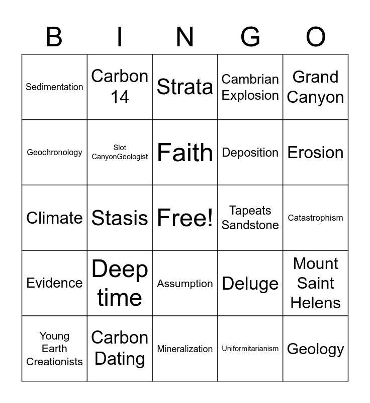 This bingo card has a free space and 24 words: Deep time, Carbon Dating, Faith, Young Earth Creationists, Grand Canyon, Sedimentation, Geochronology, Carbon 14, Tapeats Sandstone, Assumption, Deposition, Climate, Deluge, Mount Saint Helens, Slot CanyonGeologist, Uniformitarianism, Catastrophism, Strata, Erosion, Stasis, Geology, Evidence, Cambrian Explosion and Mineralization.